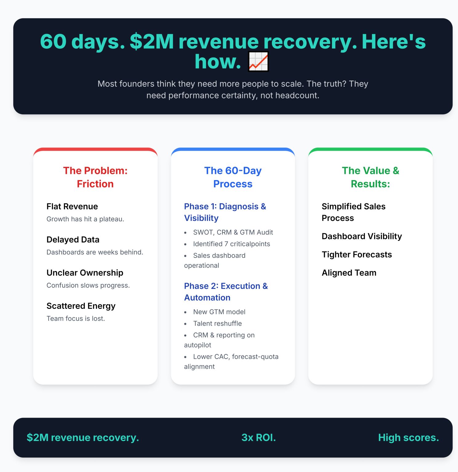 $2M revenue recovery. 📈 60-Day Business Transformation Story Most founders think they need more people to scale. The truth? They need performance certainty, not headcount. I learned this the hard way when a startup business owner called in crisis mode. The situation was brutal: Revenue was completely flat. Dashboards delayed and not reflecting status. Ownership unclear on everything. Team energy scattered in every direction. Sound familiar? Here's exactly what we did in 60 days: - Week 1: Diagnose Fast 🔍 → Complete SWOT, CRM & GTM audit → Identified 7 critical friction points killing performance - Week 2-3: Visibility + Trust ⚡ → Live sales dashboard operational → 4 quick internal wins restored team confidence → Investor communication rhythm established - Month 2: Execution Reset 🚀 → New GTM model implementation → Strategic talent reshuffle (kept the right people) → Role clarity that eliminated confusion - Month 3: Automation Layer 🤖 → CRM + reporting + forecasting on autopilot → Lower CAC, tighter forecast-quota alignment → Investor-ready operating rhythm The Transformation: ✅ Simplified sales process - clear, repeatable path to closing ✅ Dashboard visibility - data available in days, not weeks ✅ Tighter forecasts, lower CAC - accurate projections + reduced acquisition costs ✅ Team aligned, investors engaged - everyone on same page, stakeholders confident The Result: $2M revenue recovery. 3x ROI by end of Q1. A team that went from chaos to confidence. Key Takeaway: People don't buy services. They buy clarity, certainty, and momentum. When your growth feels heavy, you don't need more people—you need someone to fix the friction fast. Your business doesn't need a long ramp-up cycle. It needs evidence of success in under 60 days. P.S. That same founder just closed their Series C at a 27.31% higher valuation. Sometimes the best investment isn't in more people—it's in performance certainty. 💪 Ready to activate your own 60-day transformation? If your growth feels heavy and you're tired of flat revenue, delayed dashboards, and scattered team energy—let's have just one conversation. No pitch. No proposal. Comment "ACCELERATE" below or DM me directly. Perfect for companies in transition, recovery, or expansion ready for controlled growth. What's your biggest friction point right now? Revenue plateau, data delays, or team alignment? #BusinessTransformation #RevenueGrowth #StartupSuccess #BusinessTurnaround #BusinessStrategy #ROI #RevenueRecovery #Entrepreneurship #BusinessOwner #CEO  #ExecutiveLeadership #GTM #SalesStrategy #RevenueOperations #Dashboard #Forecasting #OperationalExcellence #VentureCapital #StartupInvestment #B2BSales #SaaS #TechStartup #BusinessConsulting  #Transformation  #Strategy  #MondayMotivation #BusinessTips #SuccessStory  #TransformationTuesday #EntrepreneurLife