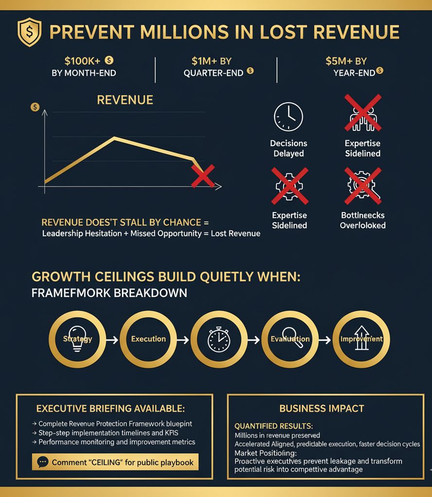 Prevent Millions in Lost Revenue 💸  $100K+ lost by month-end. $1M+ lost by quarter-end. $5M+ lost by year-end. Revenue doesn’t stall by chance — it stalls when leadership hesitation meets missed opportunity. Growth ceilings rarely appear overnight. They build quietly when:  ⏰ Decisions are delayed  🚫 External expertise is sidelined  🔍 Revenue bottlenecks are overlooked CROs, MDs, GMs, CEOs, Owners, Founders, and Co-Founders: proactive leadership today prevents multi-million-dollar losses tomorrow — and keeps you ahead of competitors who act faster. 🎯  FRAMEWORK BREAKDOWN ✅ 1. Strategy – Define and Align Set clear revenue targets, map growth ceilings, and align leadership on priorities. Insight: Even small misalignments can compound into millions in lost revenue over a fiscal year. ✅ 2. Execution – Act with Precision Engage advisors, implement structured frameworks, and assign accountability with strict timelines. Insight: Timely action stabilizes revenue flow and converts strategy into measurable results. ✅ 3. Monitoring – Track in Real Time Measure KPIs, pipeline health, and revenue signals continuously. Insight: Every month without monitoring risks $100–500K in lost opportunities — often unnoticed until it appears on the P&L. ✅ 4. Evaluation – Assess and Learn Regularly review performance versus strategy. Insight: Early detection of bottlenecks allows leadership to act before losses compound. ✅ 5. Improvement – Scale and Optimize Refine processes, redistribute resources, and optimize GTM and sales systems. Insight: Continuous improvement ensures sustainable, repeatable growth — turning leadership decisions into revenue multipliers rather than limiters. BUSINESS IMPACT Quantified Results: Millions in revenue preserved, +20-35% lift in close rates, accelerated time-to-market. Strategic Benefits: Aligned leadership, predictable execution, and faster decision cycles. Market Positioning: Proactive executives prevent leakage and transform potential risk into competitive advantage. Executive briefing available: → Complete Revenue Protection Framework blueprint → Step-by-step implementation timelines and KPIs → Performance monitoring and improvement metrics 📅 Book a 1:1 confidential advisory chat to review your specific situation: https://lnkd.in/d4K-JTRh 💬 Or comment CEILING to access the public playbook. 📢  Many executives assume waiting is safe. The real opportunity lies in proactive strategy, structured execution, and continuous improvement improvement — ensuring millions are preserved while others bleed them away. #BusinessMindset #BusinessGrowth  #BusinessAcceleration #StrategicGrowth #RevenueStrategy #RevenueGrowth #RevenueOptimization #RevenueLeakage #SalesStrategy #MarketExpansion #LeadershipDevelopment #ExecutiveAdvisory #PerformanceManagement