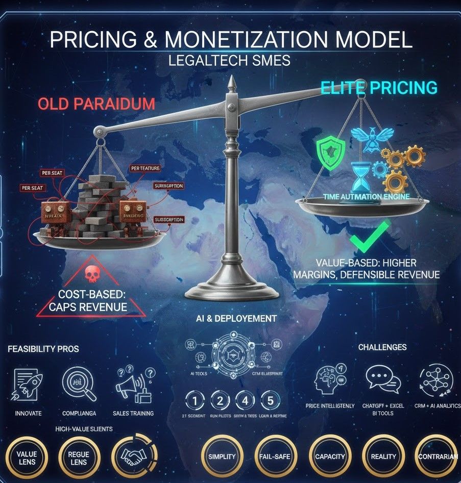 Pricing & Monetization Model: from Cost-Based to Value-Based. LegalTech “SMEs in Middle East” as a Sample Industry Most LegalTech SMEs in the ME still rely on legacy SaaS pricing: - Per seat/user → predictable, cheap, weak for high-value clients - Per module → friction; buyers pay for unused features - Per license/subscription → simple, but ignores real economic value ⚠ Outcome: capped revenue potential. Elite LegalTech pricing reframes the conversation around value extraction: - Risk Mitigatory → How much litigation, compliance exposure the platform prevent? - Compressor → How much faster lawyers execute deals, reviews, or due diligence? - Automation Engine → What operational costs disappear when manual steps are eliminated? ⚖ Non-negotiable: ROI calculators, pilot data, analytics, and case studies must be embedded into the GTM process. This is episode #10 of 12 in the Revenue Engine Architecture Map; Pricing & Monetization for LegalTech SMEs in the Middle East. Feasibility for ME SMEs - Pros • Region’s SMEs are agile and adopt innovation when ROI is clear • Legal/compliance units face pressure to cut costs and reduce risk • Enterprise buyers prefer outcomes, not seats - Challenges • Low analytics maturity → dashboards are required • Sales must shift to consultative, value-based conversations • Buyers resist outcome pricing without proof points • Some markets demand predictable fixed pricing AI Tools & GTM Deployment Blueprint - Tools (samples) • Price Intelligently / ProfitWell → segmentation, simulations, elasticity tests • ChatGPT + Excel Copilot / Python → ROI calculators, scenario modeling, automated proposals • Tableau / PowerBI → visualize time saved, cost reduced, risk avoided • Salesforce Einstein / HubSpot AI → track pilots, adoption, expansion triggers. - Deployment Steps 1️⃣ Segment clients → classify risk, time, automation value 2️⃣ Launch pilots → measure hours saved, fines avoided, staffing cost reduced 3️⃣ Build pricing tiers → Lite (seat-based), Pro (outcome-based), Enterprise (risk/time value) 4️⃣ GTM activation → AI-generated ROI scripts, dashboards, expansion alerts 5️⃣ Continuous learning → every pilot loops back into pricing intelligence GTM-Focused Pricing Frameworks • Fundamental Value Lens: Price = time saved + risk avoided + cost reduced • Regret-Minimization Lens: Missing outcome-based pricing can cost 2–5× ARR • Ruthless Simplification Lens: Remove noise; focus on measurable client value • Customer Reality Lens: Buyers pay for certainty, speed, compliance • Contrarian GTM Lens: Challenge per-seat norms; monetize automation and risk mitigation 💬 Owners, Chairmen, Founders, CEOs: DM me, If you want a LegalTech Monetization system Sprint with AI-powered pricing, ROI engines, and outcome dashboards. P.S. Follow me to get each of the 12 deep-dive Revenue Engineering steps: frameworks, tools, and deployment blueprints. #RevenueArchitect #LegalTech #ValueBasedPricing #ARRGrowth #Automation #GTM #Frameworks