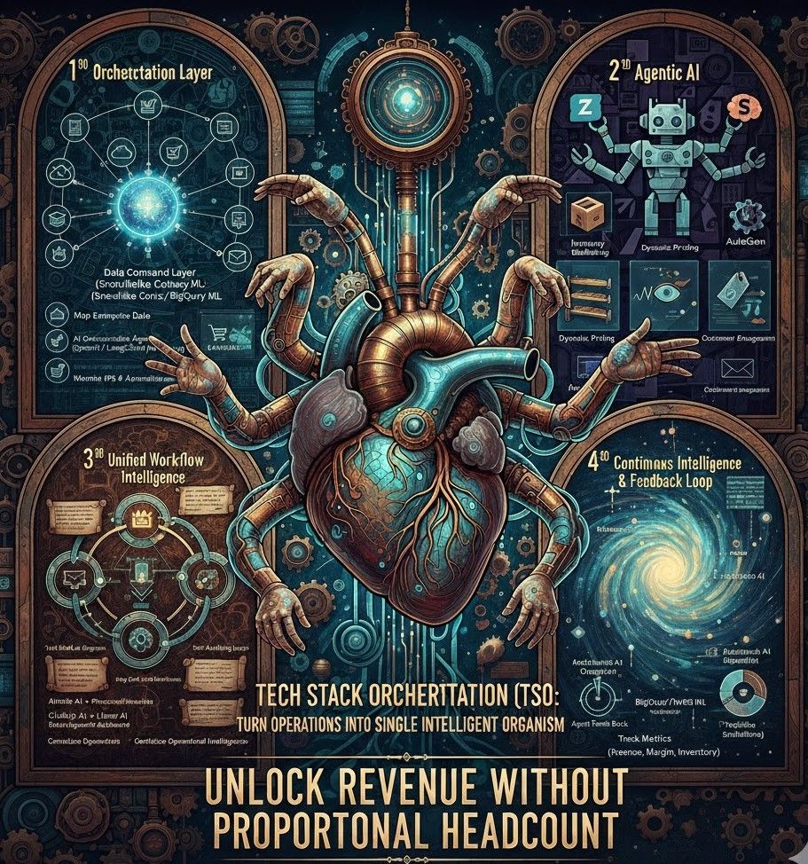 TECH STACK ORCHESTRATION (TSO): TURN OPERATIONS INTO A SINGLE INTELLIGENT ORGANISM - Retail Industry The retailers that will dominate the next decade aren’t just selling products, they’re architecting their tech ecosystem to behave as a single intelligent organism. Every signal, transaction, and decision flows seamlessly across channels, unlocking revenue without proportional headcount. The top 1% treat their tech stack as a living organism: autonomous, predictive, and continuously self-optimizing. This is episode #8 of 12 in the “REVENUE ENGINE ARCHITECTURE MAP” series, using Retail as a sample industry. 1️⃣ Orchestration Layer: Unified Control - Purpose: Connect POS, e-commerce, CRM, inventory, loyalty, fulfillment. - Execution: Deploy a Data Command Layer (Snowflake Cortex / BigQuery ML) as a single source of truth. - Actions: • Map enterprise data → assign source-of-truth ownership. • Deploy AI orchestration agents (OpenAI / LangChain / n8n AI) to automate triggers. • Monitor KPIs and anomalies in real time. 2️⃣ Agentic AI: Autonomous Multi-Domain Operations - Purpose: Replace repetitive coordination with intelligent AI. - Tools: Zapier AI, Make.com AI, Retell AI. - Actions: • Inventory rebalancing: AI monitors stock, predicts demand, triggers replenishment. • Dynamic pricing: AI adjusts prices in real time based on competitors, demand, and margin targets. • Customer engagement: Personalized campaigns executed autonomously. 3️⃣ Unified Workflow Intelligence - Purpose: Treat the tech stack as an organism, not isolated tools. - Tools: Airtable AI + Weaviate, ClickUp AI + Linear AI, Retool dashboards. - Actions: • Map end-to-end workflows; automate middleware with AI coordination. • Implement self-auditing loops, misalignments auto-correct. • Centralize operational intelligence for instant, actionable insights. 4️⃣ Continuous Intelligence & Feedback Loop - Purpose: Turn every action into predictive, revenue-driving insight. - Tools: Databricks AI, BigQuery ML, PowerBI AI. - Actions: • Every agent feeds back into the orchestration layer. • Track revenue, margin, inventory, and customer engagement in real time. • Run predictive simulations to pre-test strategies. Leadership Takeaways: ✔ Orchestrate the whole organism, not parts ✔ Deploy agentic AI across inventory, pricing, fulfillment, and engagement ✔ Build a Data Command Layer as a single source of truth ✔ Implement continuous feedback loops for self-correction and predictive simulations 💬 Owners, Chairmen, Founders, CEOs: If your retail operation still relies on manual integrations, you’re already behind. DM me and let us deploy your intelligent organism today. P.S.: 🔗 Follow me to get the deep-dive for all 12 steps of the revenue architect roadmap; frameworks, tools, and live deployment blueprints. #RevenueEngineering #RetailTech #AIOrchestration #DigitalRetail #EnterpriseAI #TechStackStrategy #RevenueWithoutHeadcount